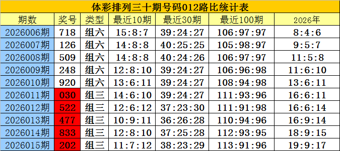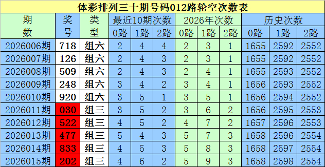 开奖顾虑:胪列三第2026015期奖号为:202,号码012路比为1:0:2。